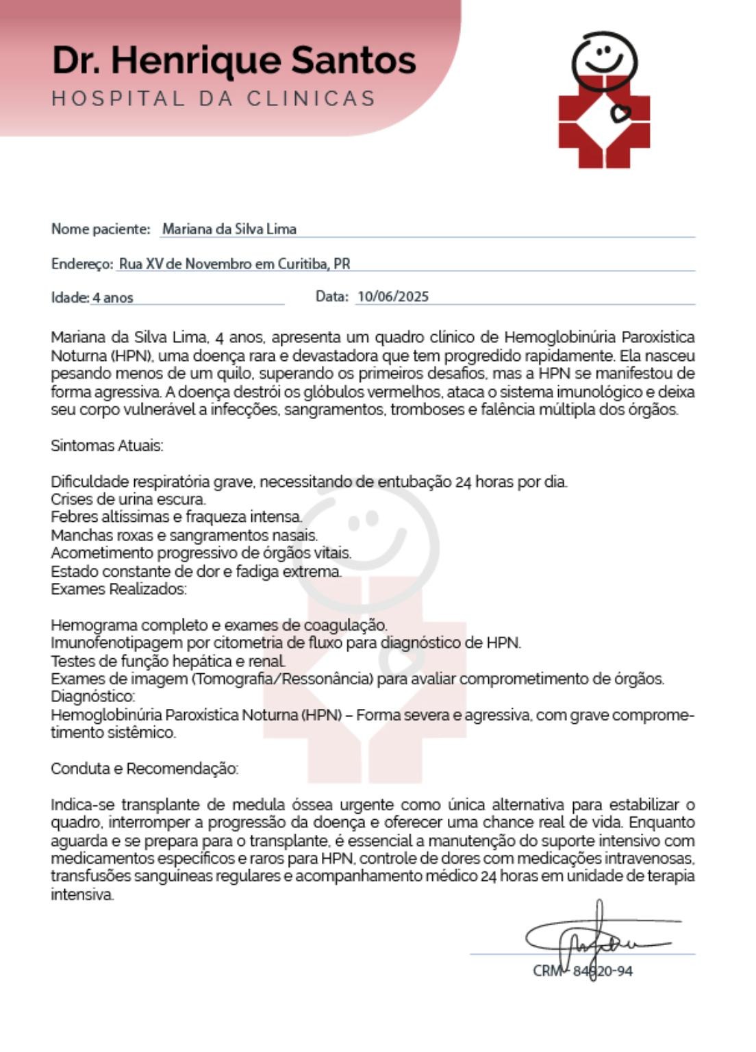 Nos últimos meses, Mariana estava realizando o tratamento básico contra a HPN, que consistia em inibidores do sistema complemento (como eculizumabe), transfusões, anticoagulantes.